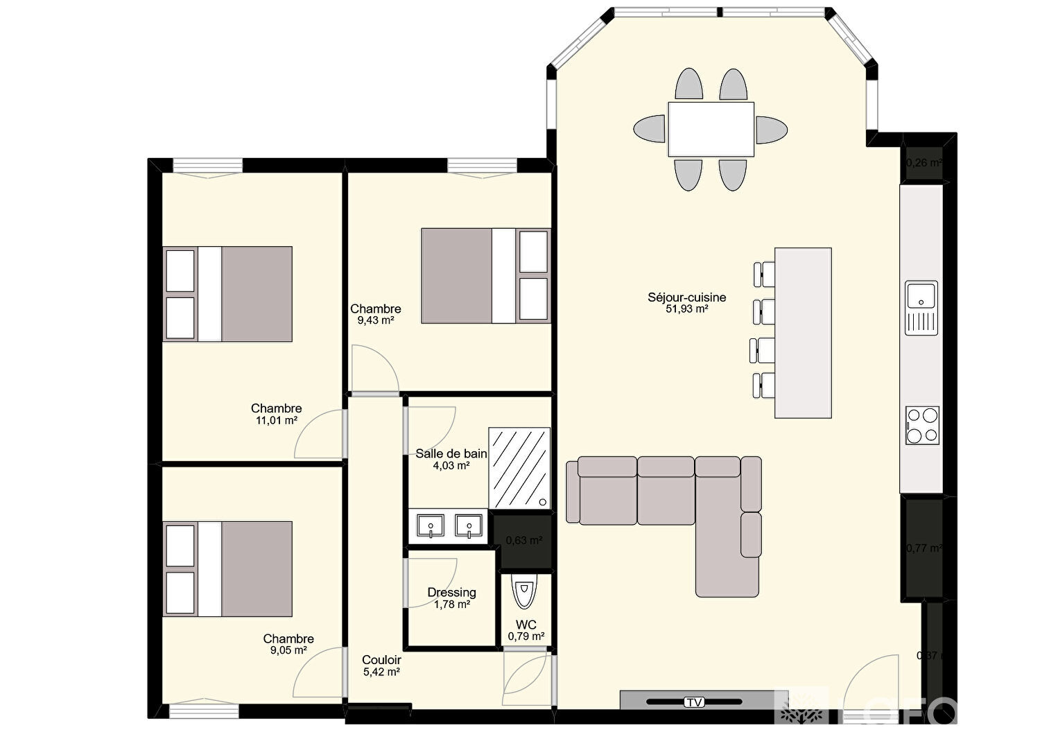 Superbe appartement de type 4, 3 chambres avec cellier. Etat irréprochable avec prestations de grandes qualités, Espace de vie de plus de 50 m2 avec cuisine américaine intégralement équipée. Volets roulants électriques de partout, climatisation réversible.