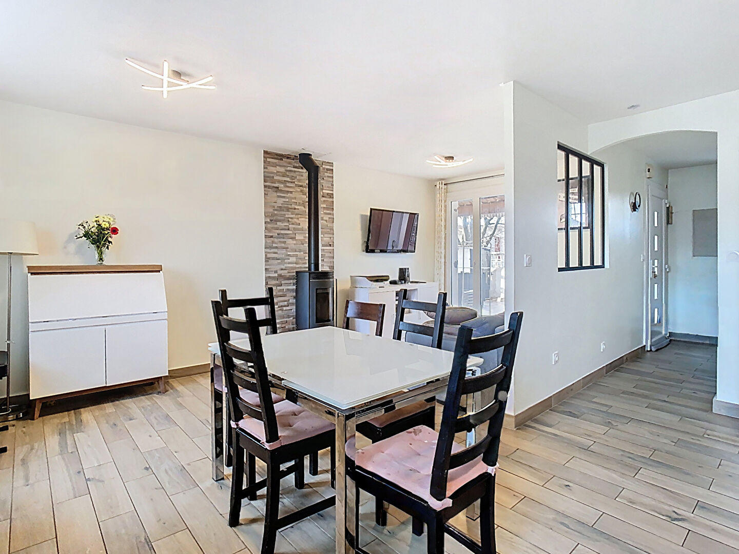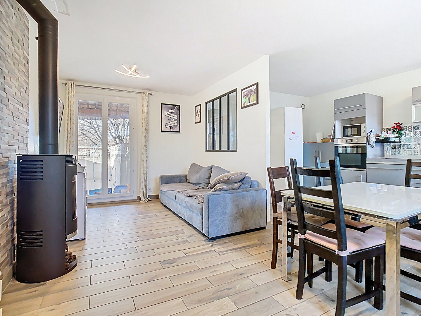Très bon état général, chauffage avec un Poêle à bois contemporain.