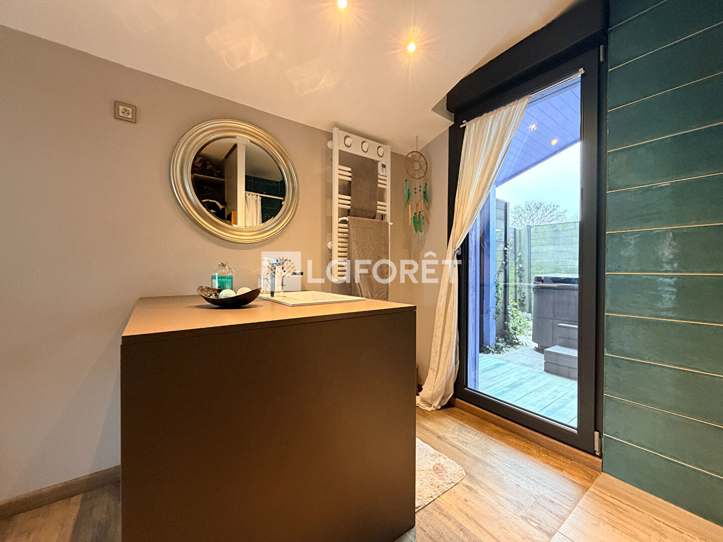 Elle offre une entrée avec placards, un couloir menant à un WC, une suite parentale avec accès à une terrasse privative équipée d'un jacuzzi, ainsi qu'une cuisine ouverte sur un salon/séjour lumineux et une buanderie.
