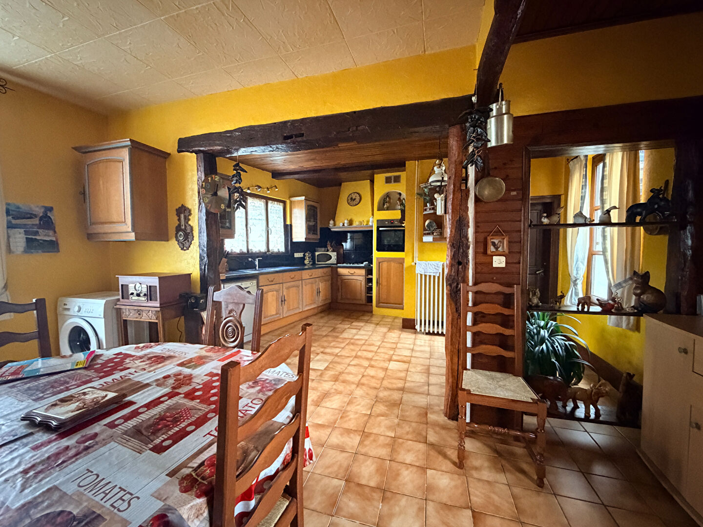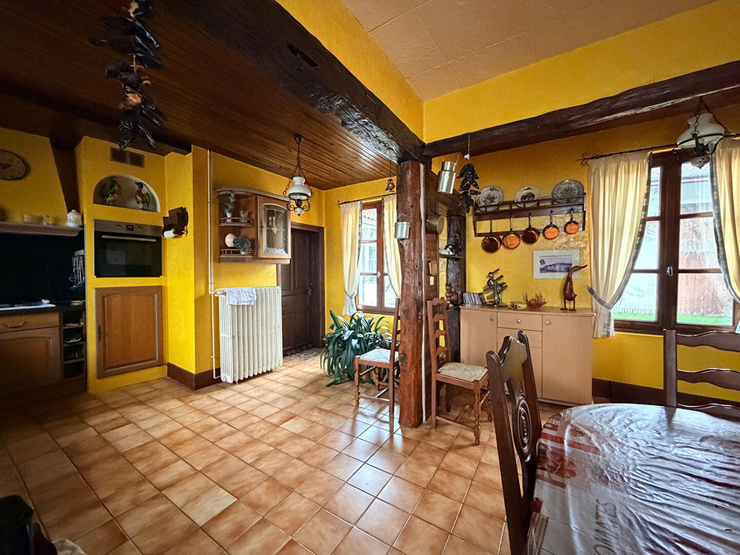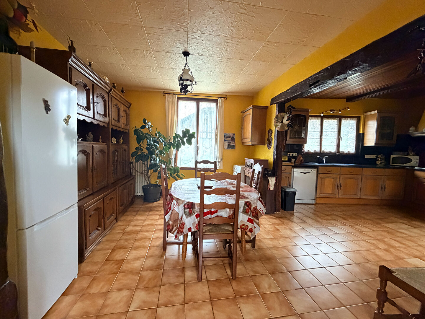 d'un côté, une grande cuisine spacieuse, idéale pour les moments de convivialité ; de l'autre, un salon / salle à manger lumineux desservant un bureau, parfait pour le télétravail ou une activité indépendante.