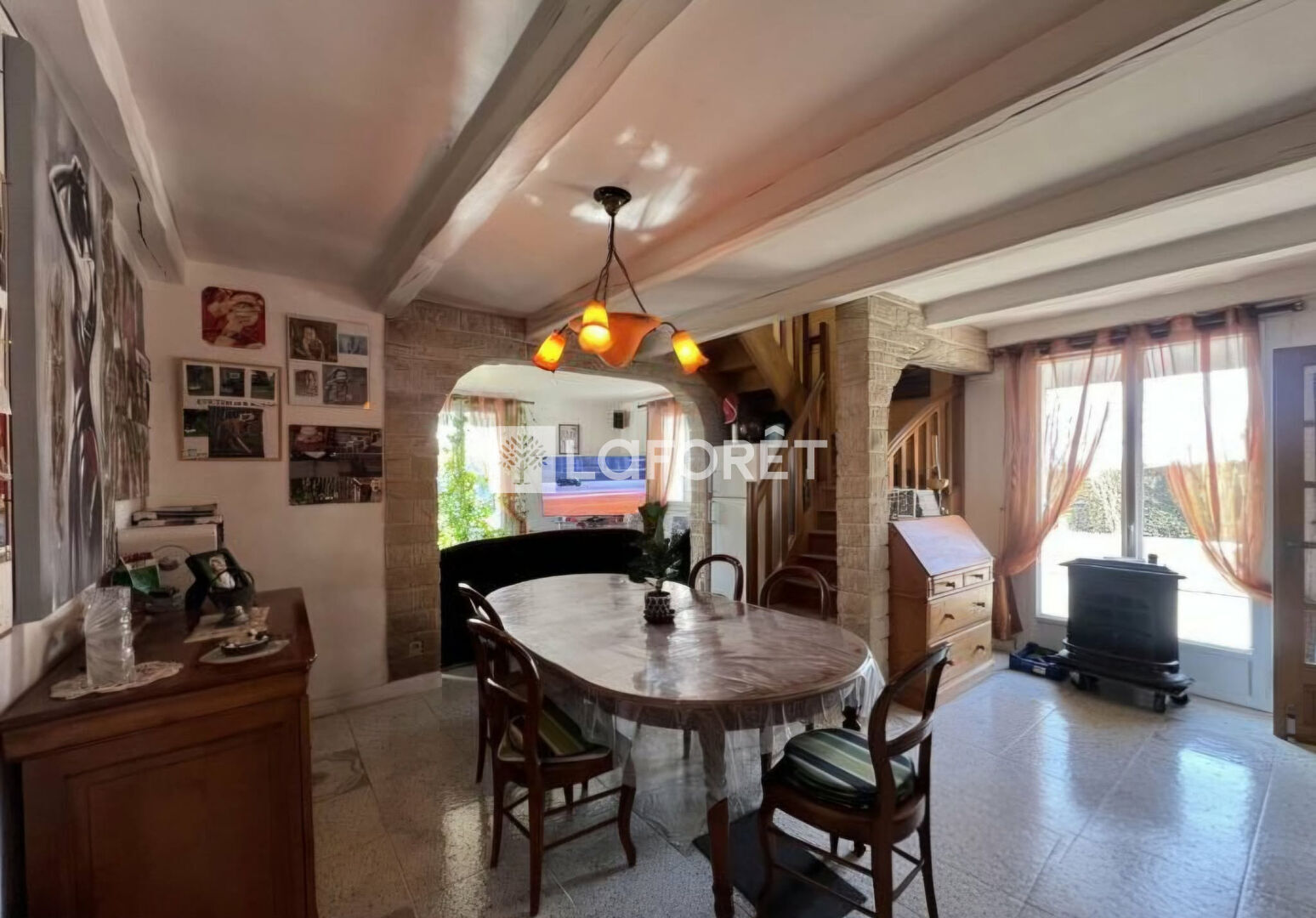 Au rez-de-chaussée, se trouve un séjour avec poêle à granulés et accès à la terrasse. La grande cuisine aménagée et équipée complète cet espace de vie. Côté nuit, la maison possède trois chambres et une salle de bain.