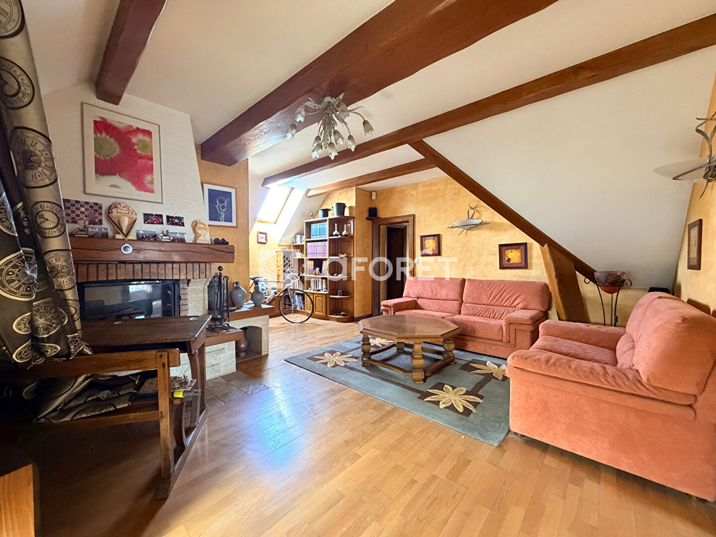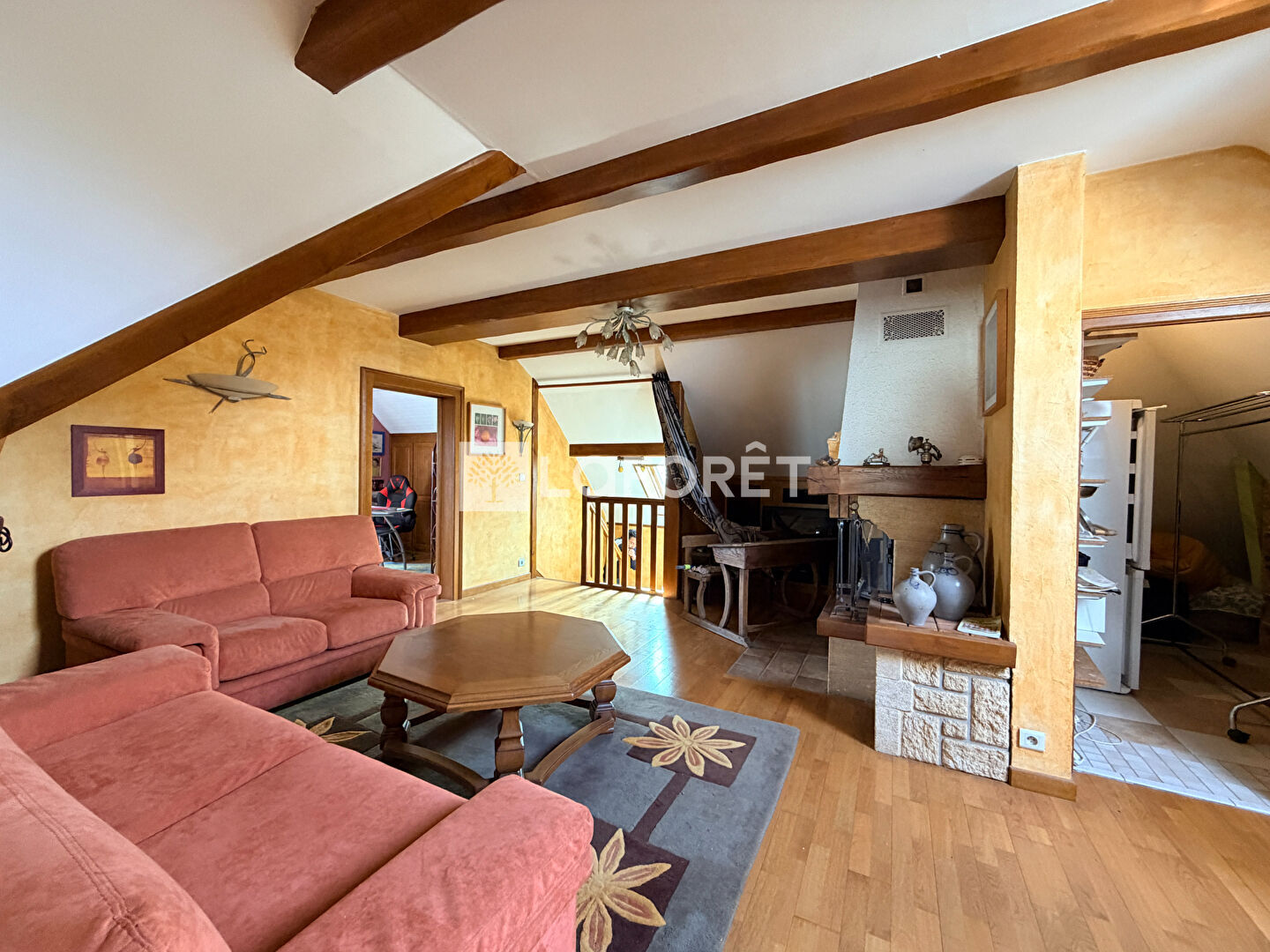 À l'étage, une grande mezzanine avec cheminée offre un espace chaleureux, idéal pour un coin lecture ou un salon cosy.