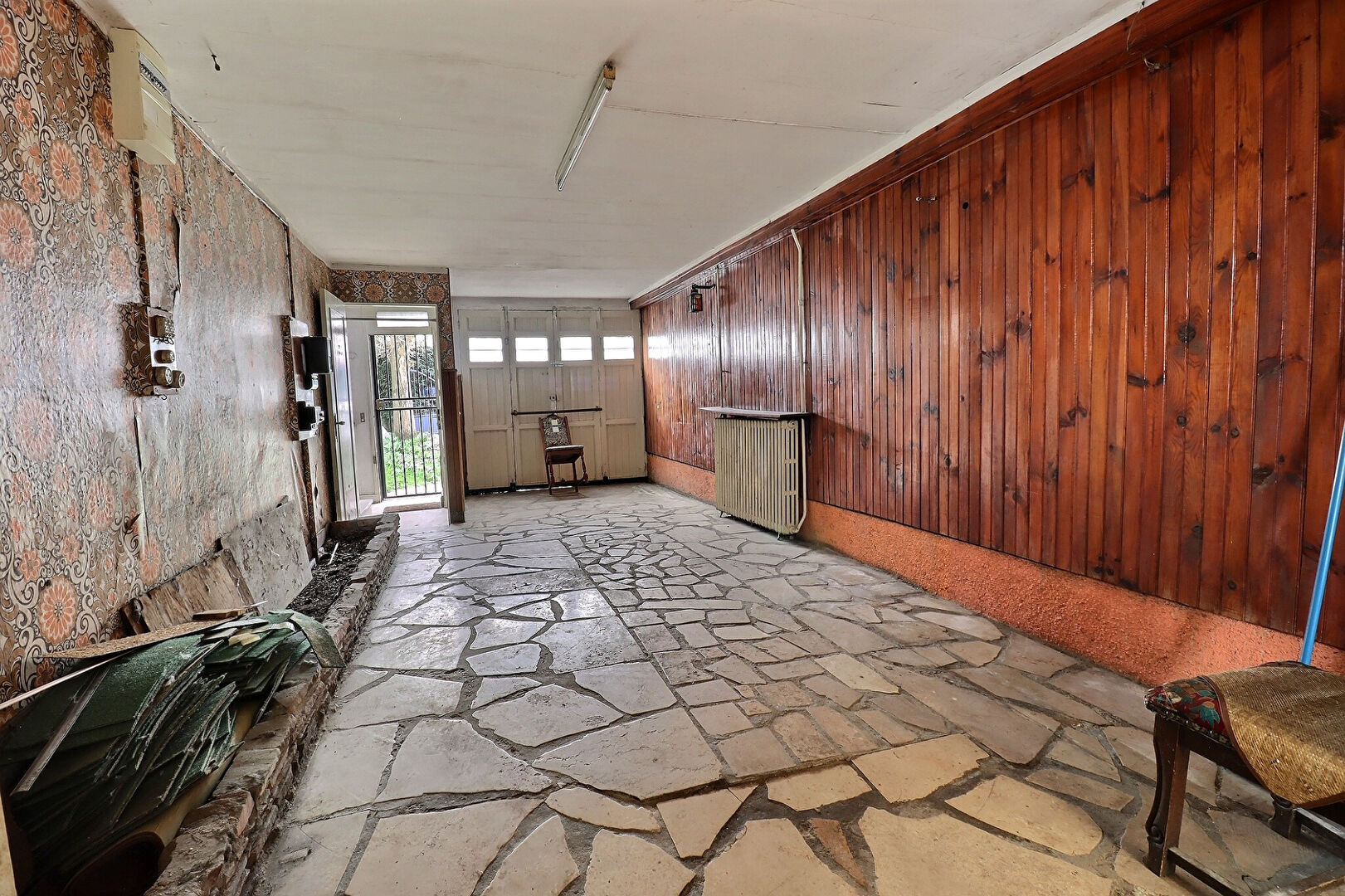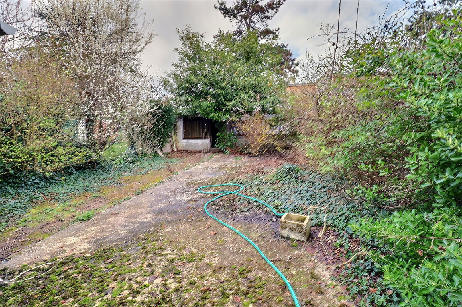 - au rez de jardin : Entrée, chambre, salle d'eau, chaufferie, WC et garage.