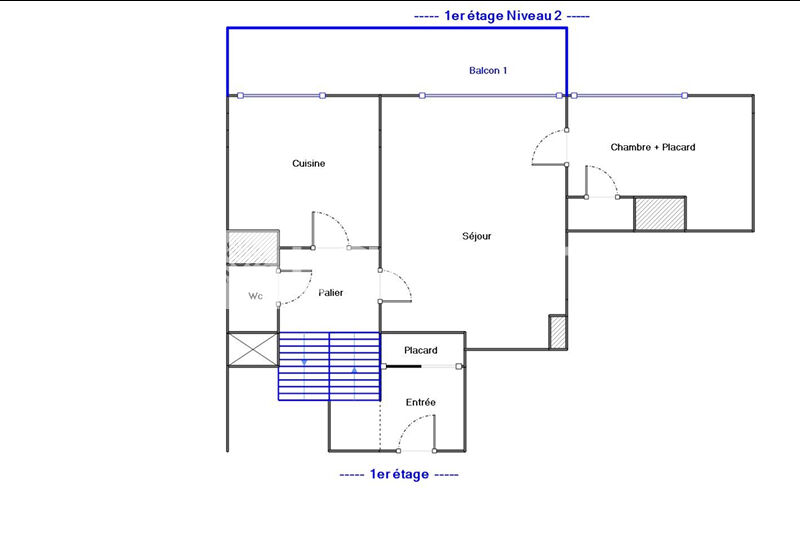 Au premier niveau : une entrée avec placard, un séjour lumineux ouvrant sur un balcon, une cuisine indépendante, un WC et une première chambre.