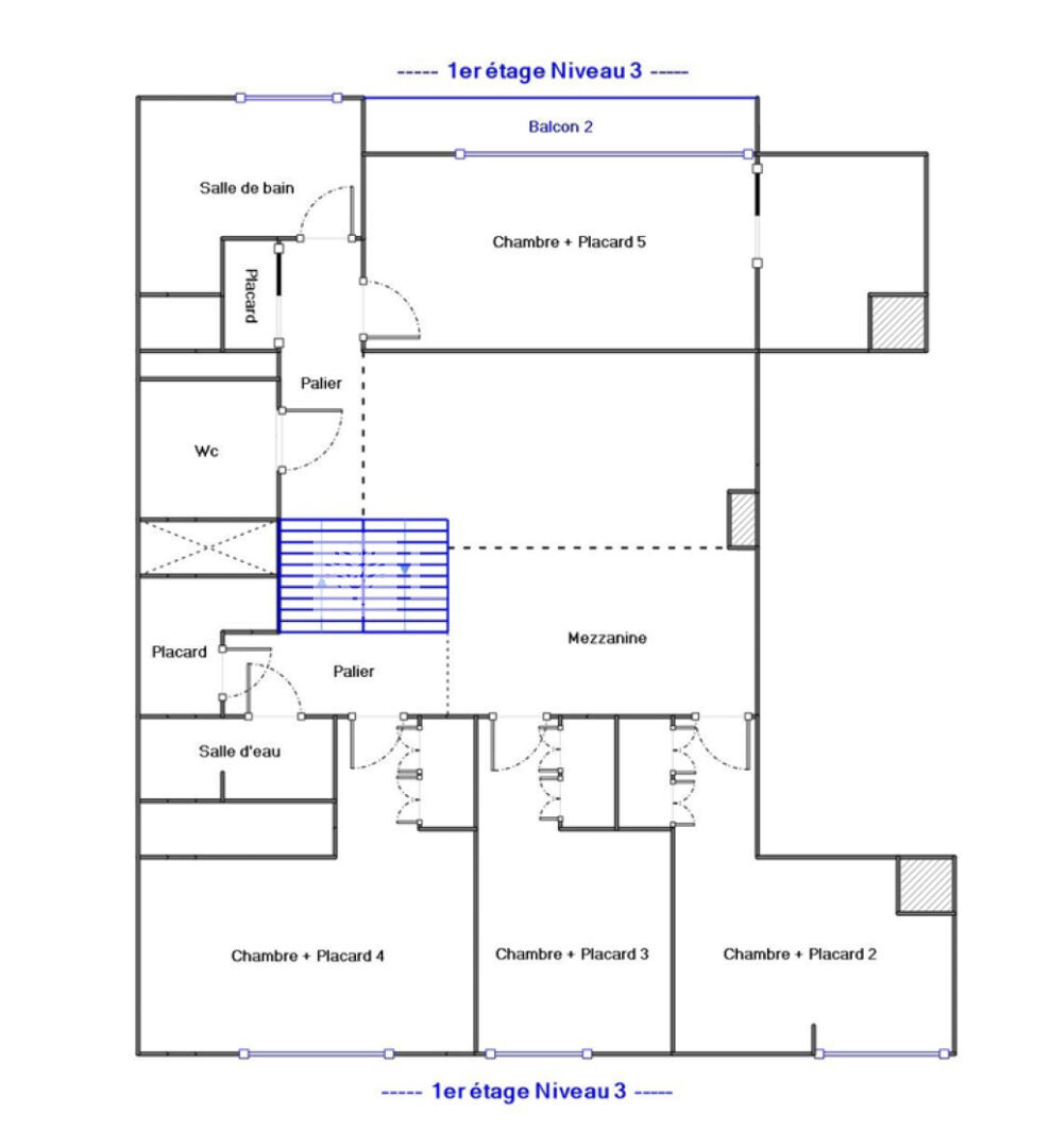 En demi-palier : trois chambres supplémentaires, une salle d'eau, un espace rangement, ainsi qu'une mezzanine parfaite pour un bureau ou un coin lecture.