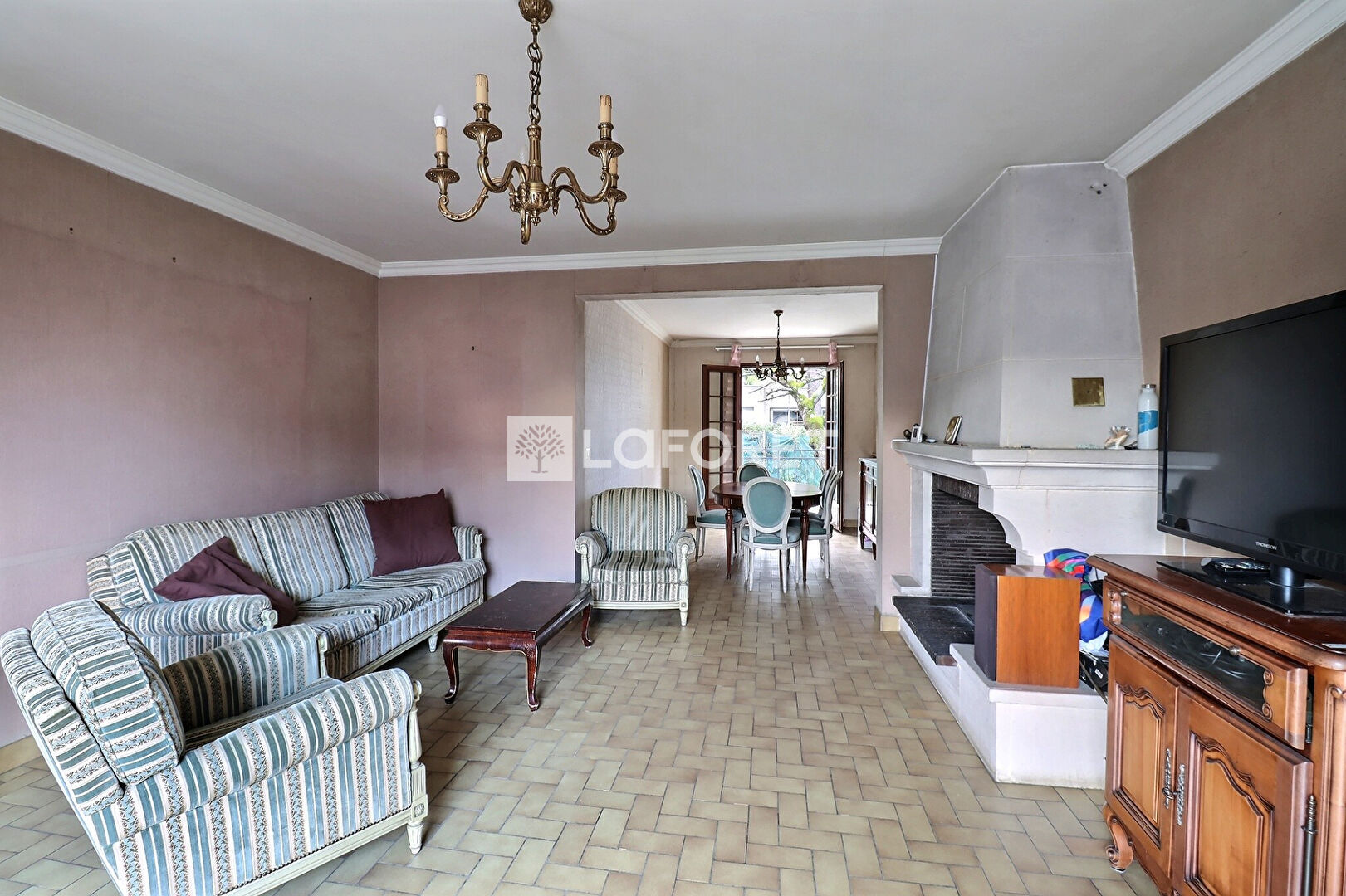 Elle se compose au rez-de-chaussée d'un séjour double (33 m²) avec cheminée et accès au jardin, cuisine indépendante, deux chambres, salle de bains et de WC séparés.