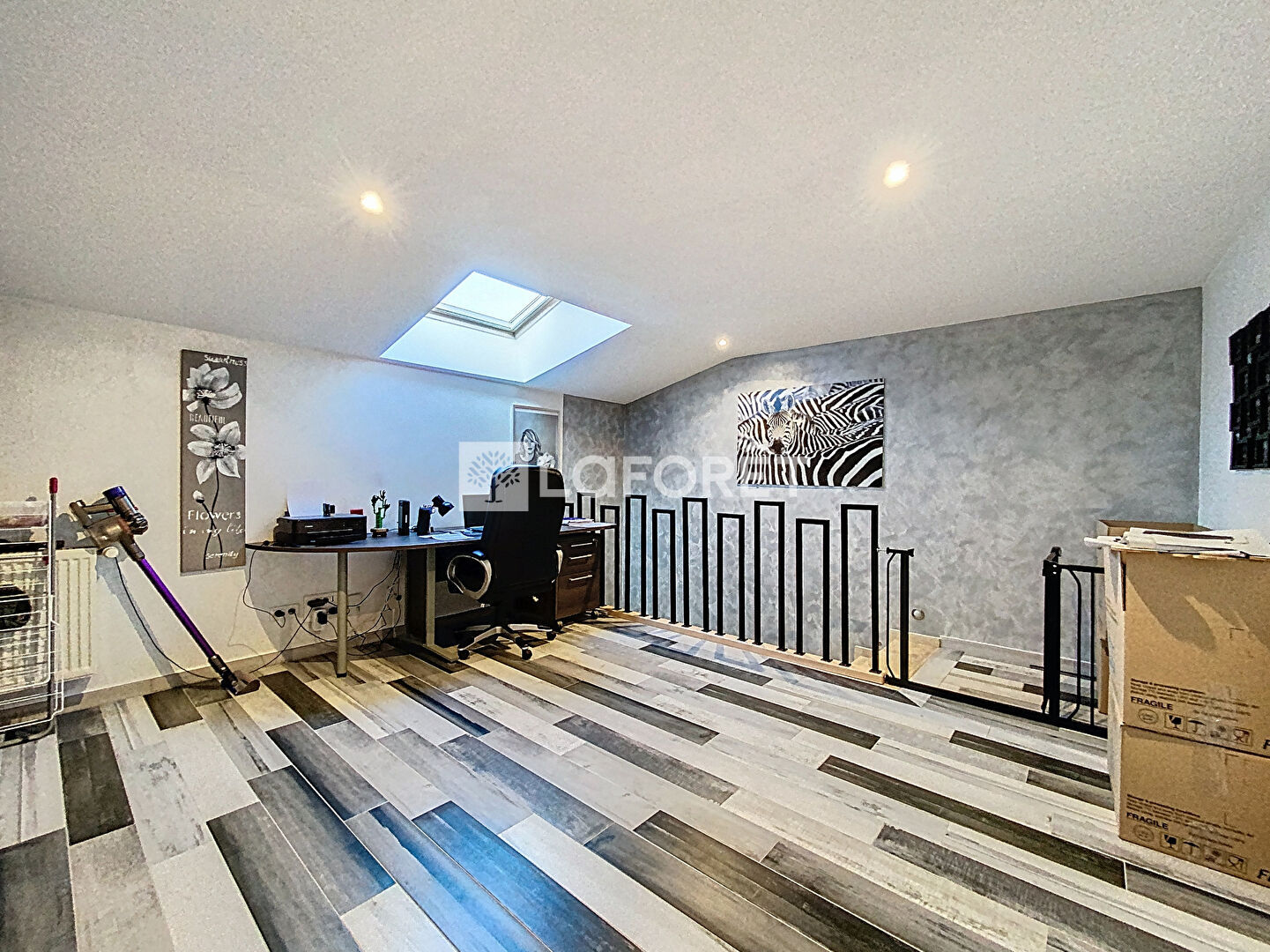À l'étage, une agréable mezzanine dessert deux chambres équipées de placards de rangement, ainsi qu'une salle d'eau moderne.