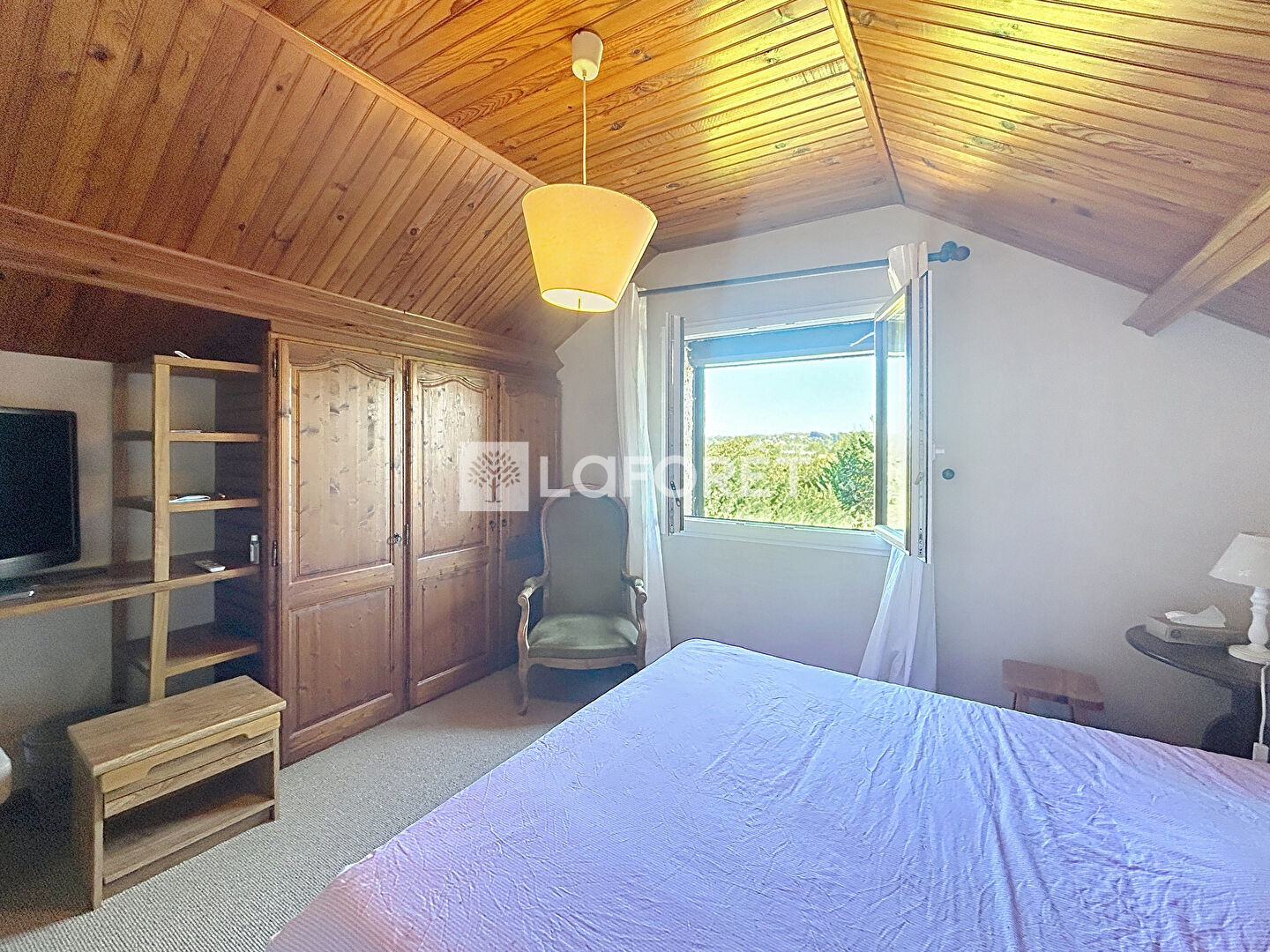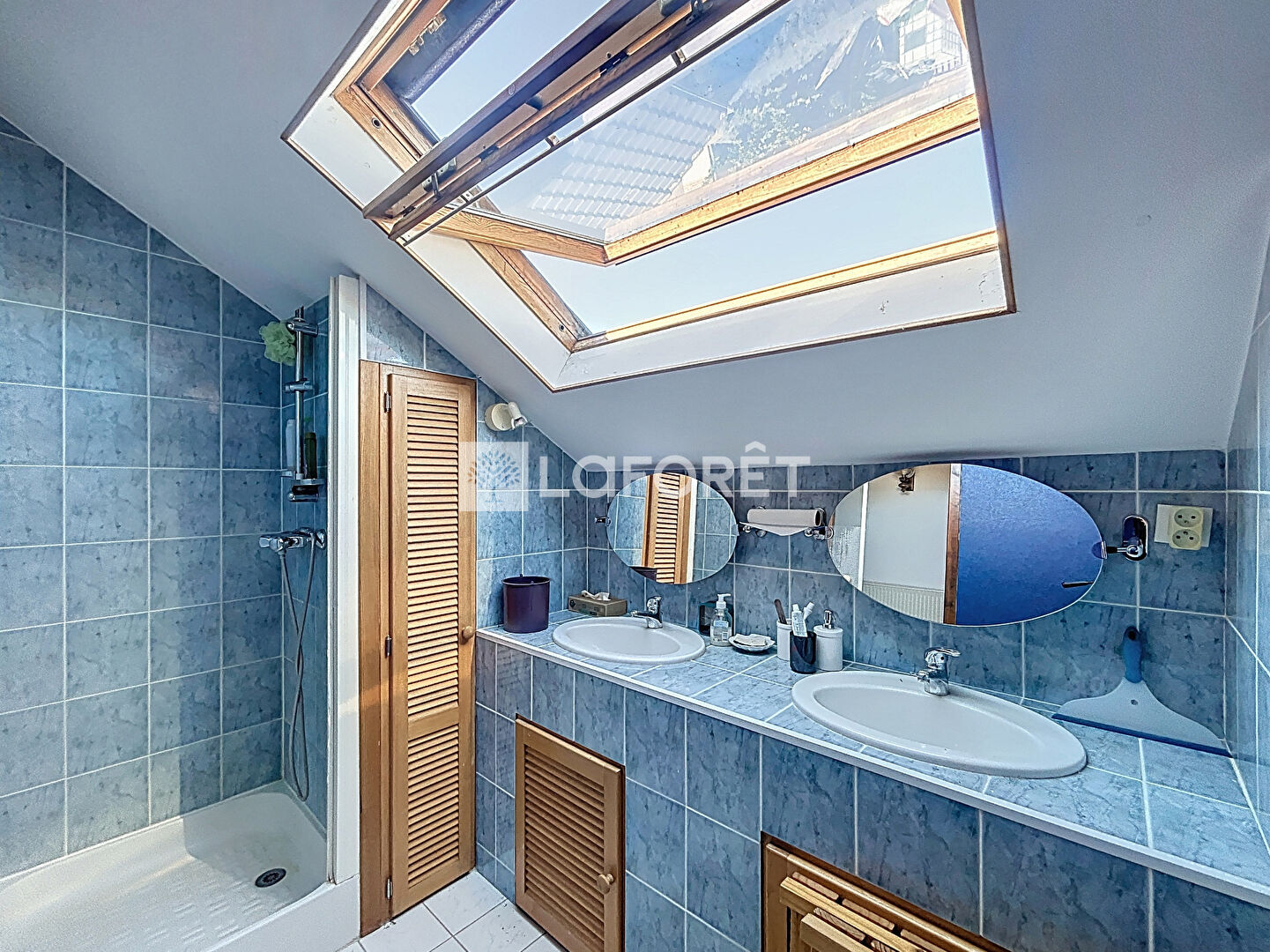 À l'étage, deux chambres supplémentaires viennent compléter le bien. Une salle de douche moderne avec double vasque ainsi que des toilettes indépendantes complètent ce niveau. Un grenier offre également un espace de stockage appréciable.