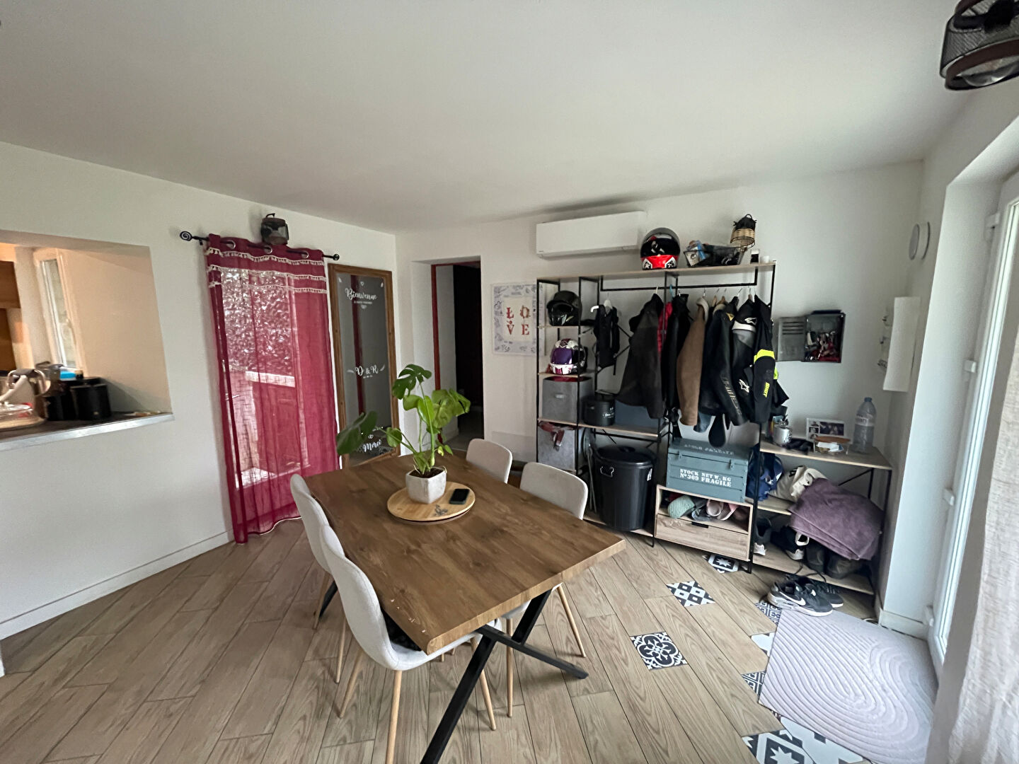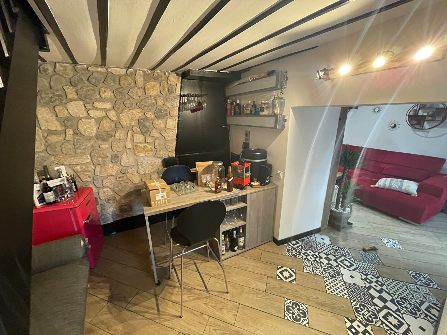Une cuisine, salon, salle à manger, un coin bar, buanderie, une salle d'eau avec wc, et une chambre.