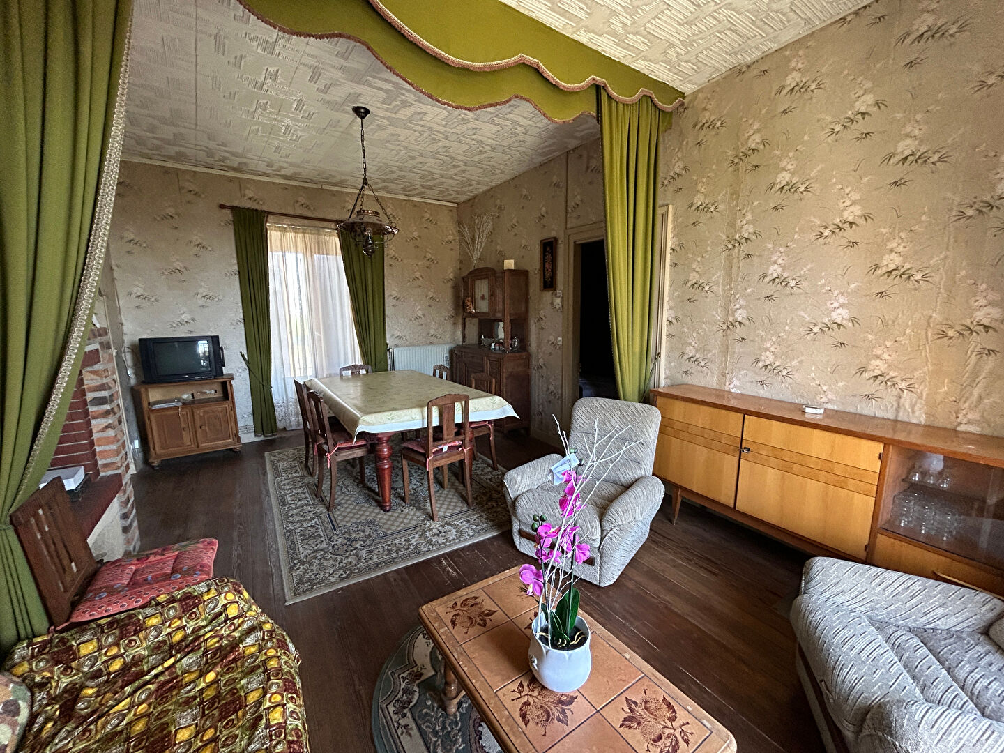 Maison de plain pied comprenant une entrée, cuisine, salon, salle à manger, salle de bains avec wc, deux chambres.