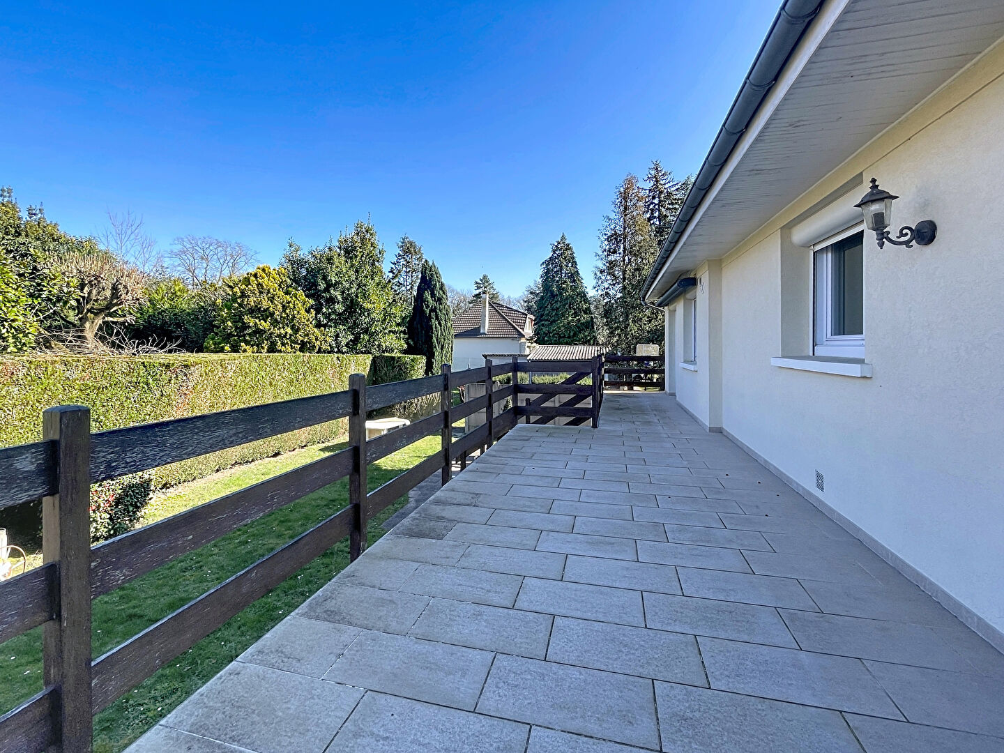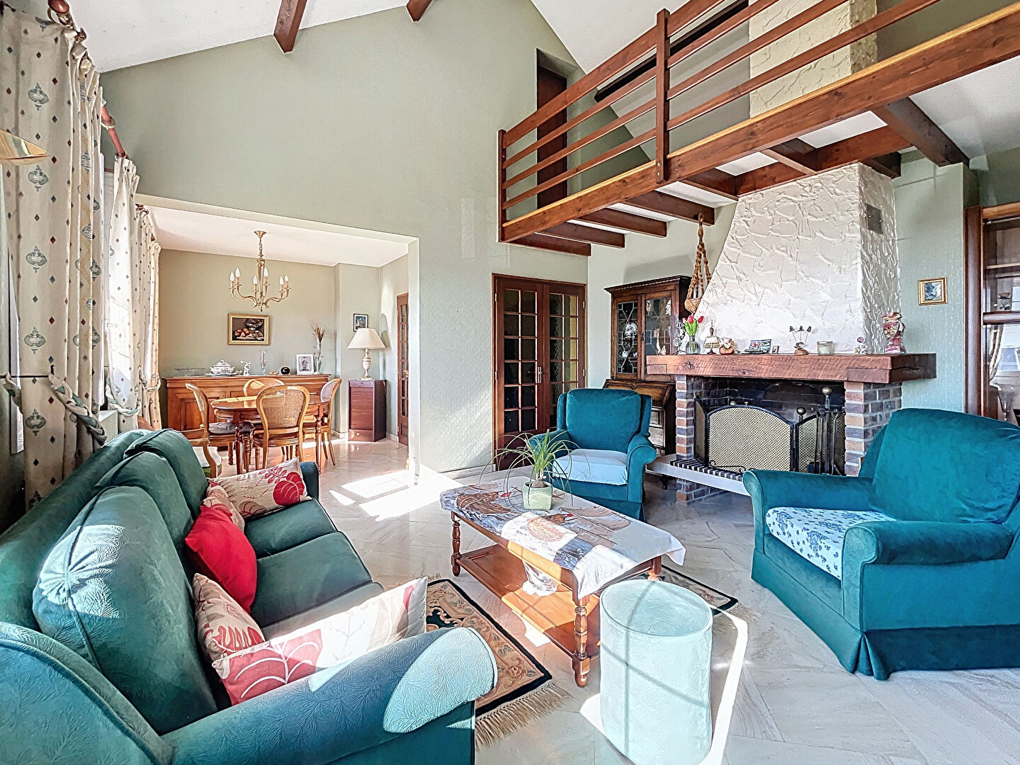 Au rez-de-chaussée surélevé : un séjour double avec cheminée, une cuisine équipée avec accès direct à la terrasse, deux chambres dont une accès à la terrasse, une salle de bains et des WC indépendants.