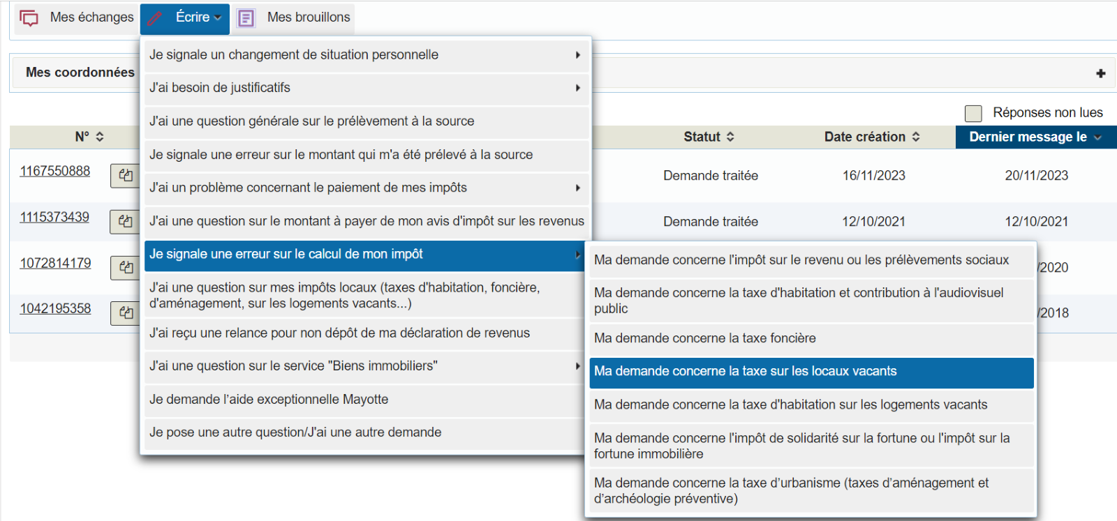 Puis choisir : Ecrire / Je signale une erreur sur le calcul de mon impôt / Ma demande concerne la taxe sur les locaux vacants.