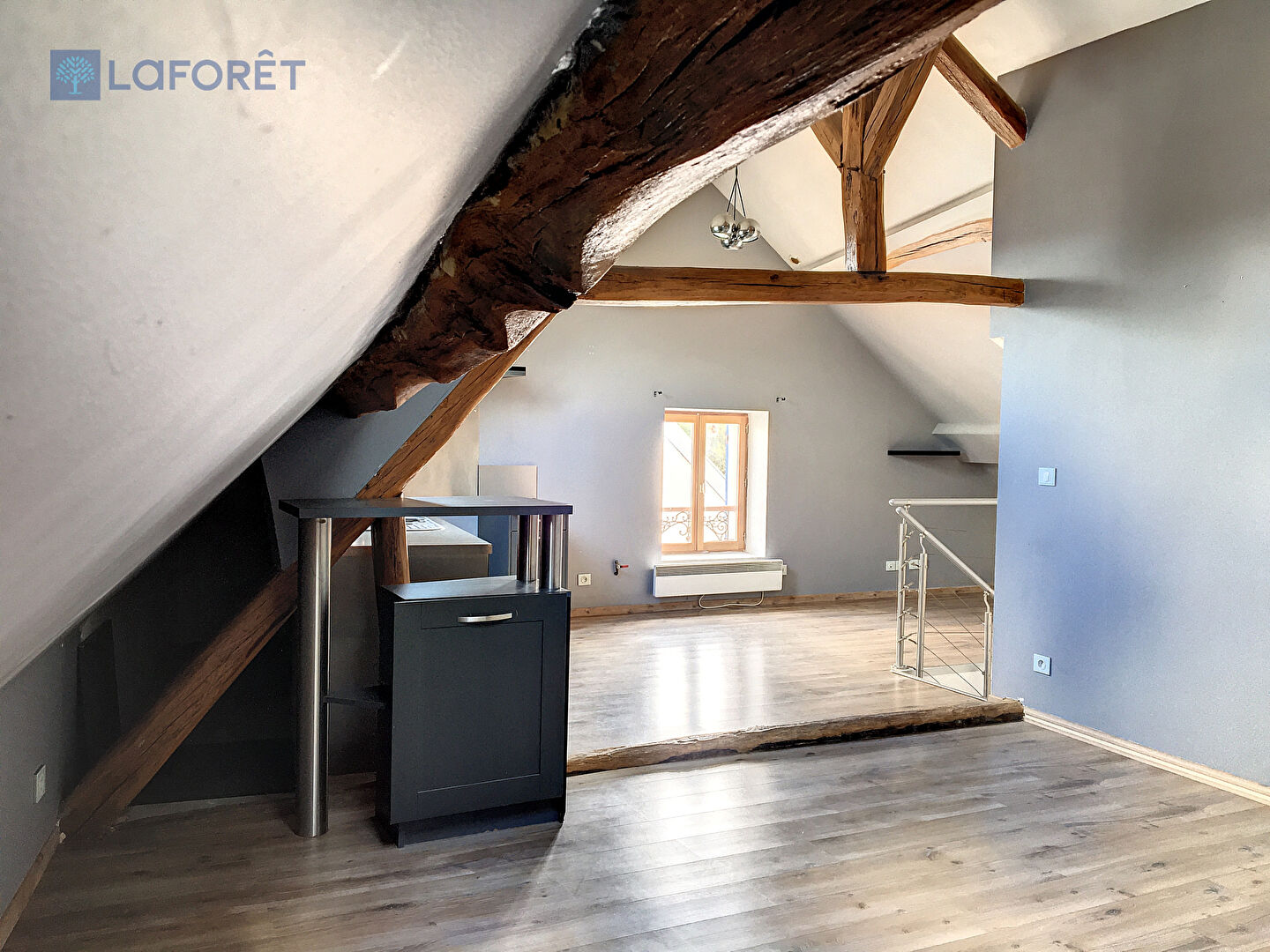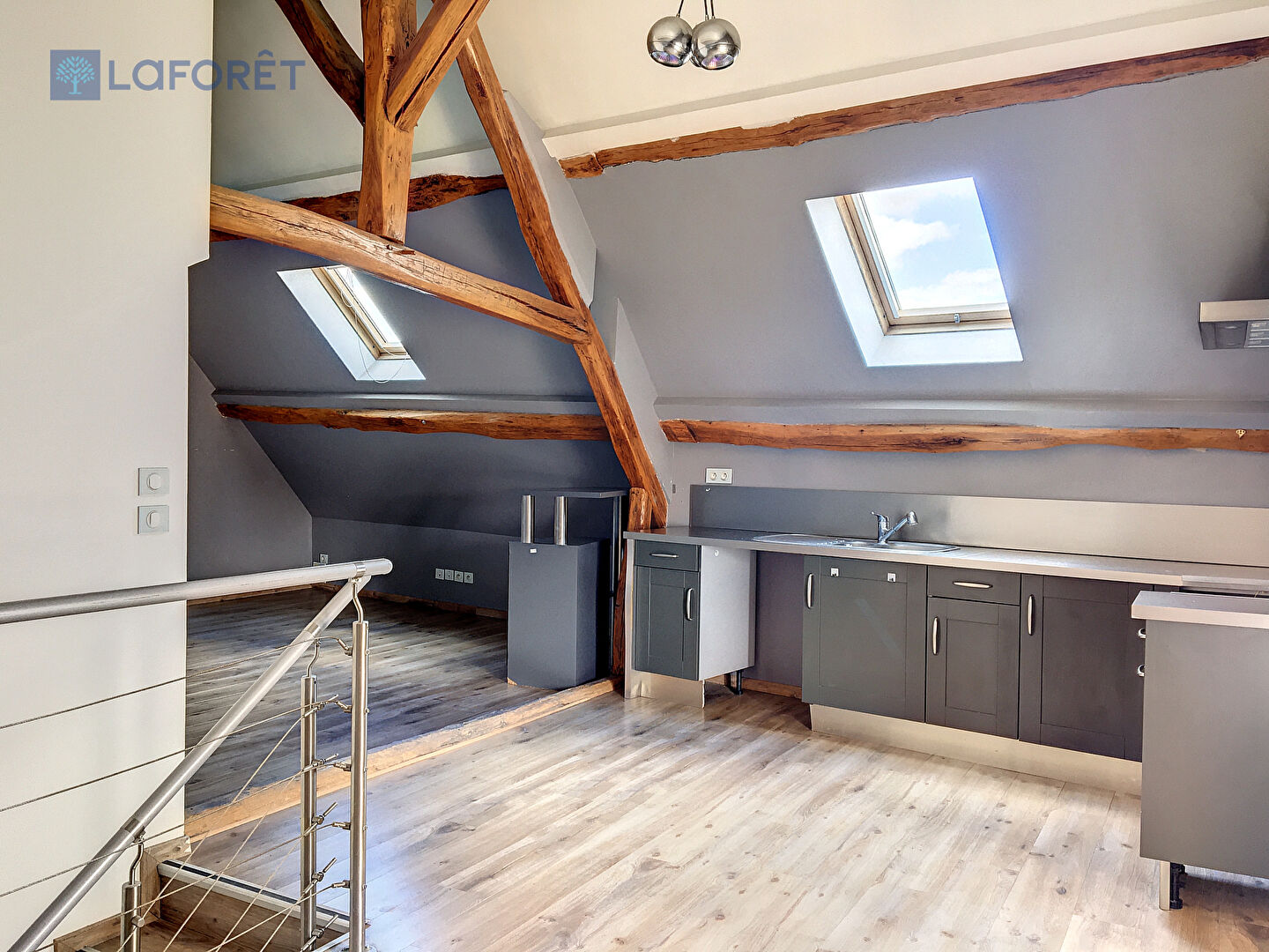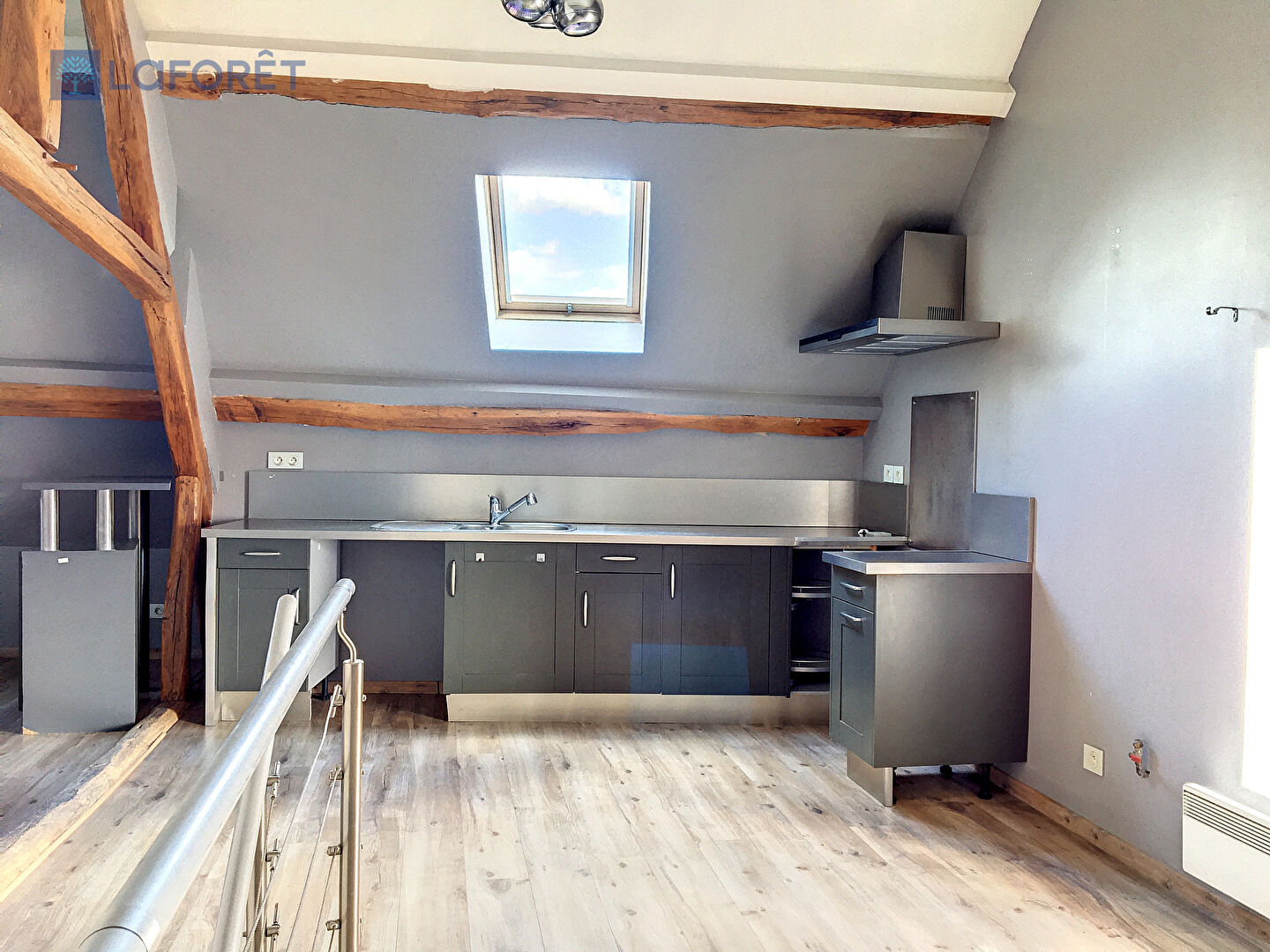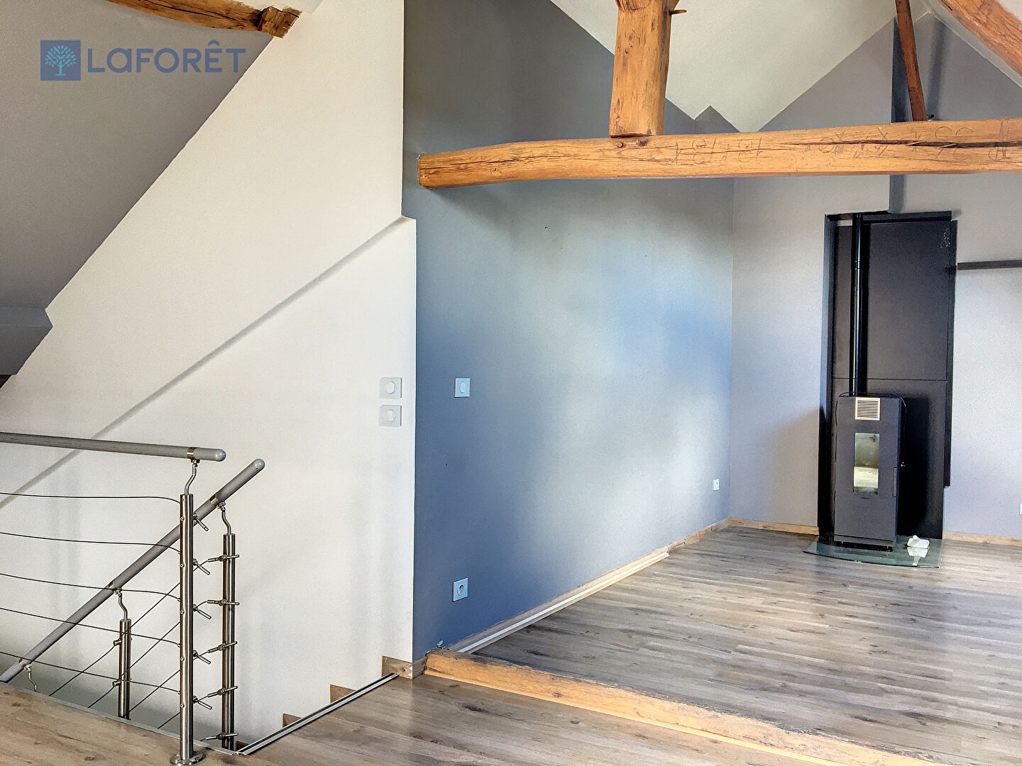 Au dernier étage : une grande pièce de vie avec poêle à bois, grande cuisine aménagée et une grande hauteur sous plafond.