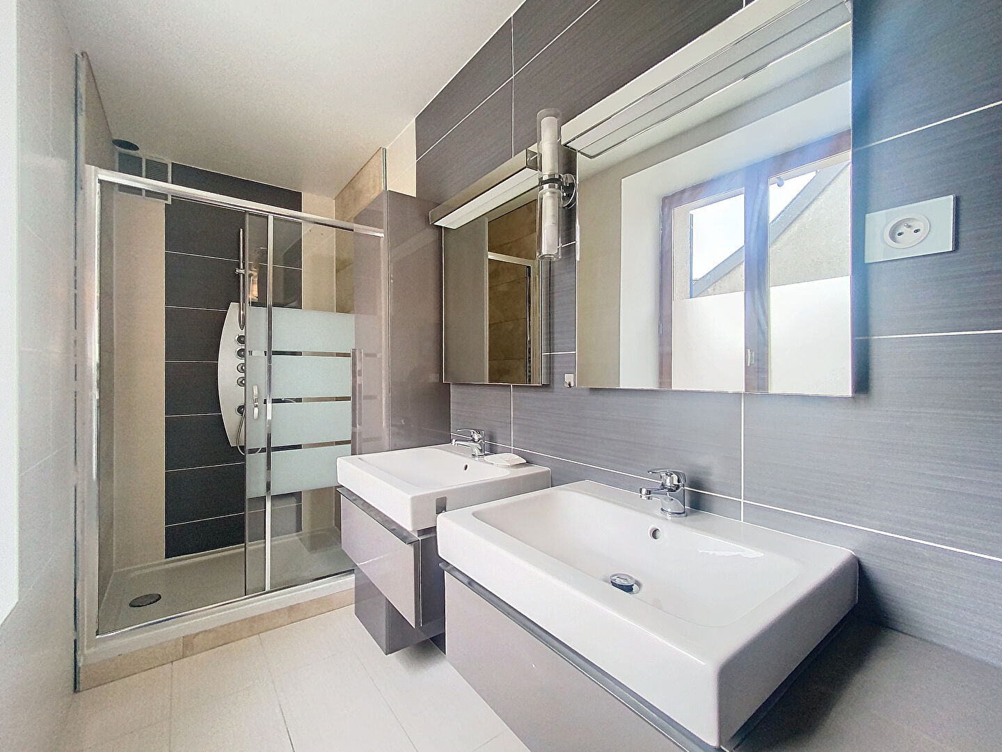 Au premier étage, une chambre avec une très belle salle de douches attenante.